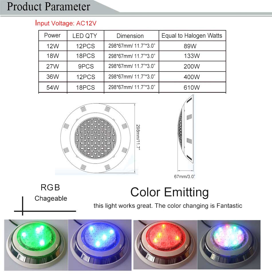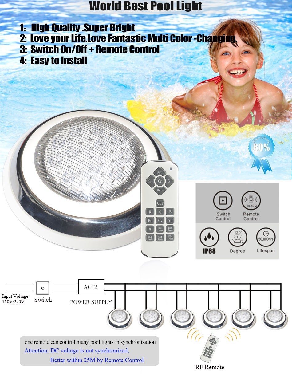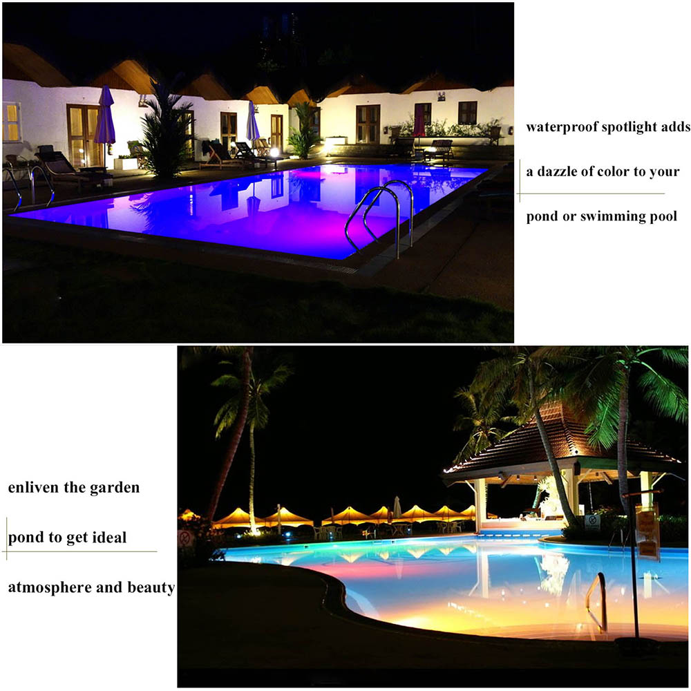 LED Swimming Pool Lights are widely used in swimming pool, spring, water view, artificial waterfall and other outdoor lightings, and can make RGB lighting effects with the remote control .